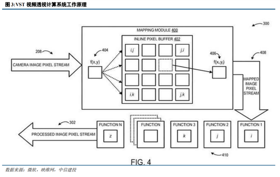 在视频透视计算系统中,主要包括映射模块、图像信号处理模块等。映射模块对图像传感器摄像头坐标空间的每个像素进行单步几何映射,并生成映射的图像像素流。映射的图像像素流再通过图像信号处理模块,可生成改进图像质量后的真实场景图像像素流,主要处理方式包括镜头畸变校正等。由于虚拟图像在与经加工的真实图像合成前无需进行操作,因此需要通过设置同步缓冲器来保证虚拟、真实图像像素时间同步。在合成环节,合成器将虚拟与真实像素流中的对应像素进行混合,混合时还需要考虑分层问题,往往通过像素的Alpha通道值(透明度)来实现。VST技术能力对于最终设备体验起到重要作用,更先进的算法以及更高效的系统流程设计方案,有助于为用户提供更清晰、更贴近真实、更低时延的虚拟与现实相融合的画面,同时尽可能减小眩晕感。