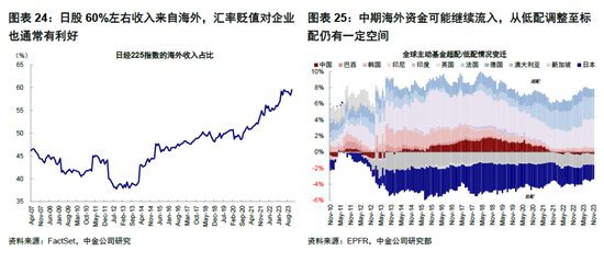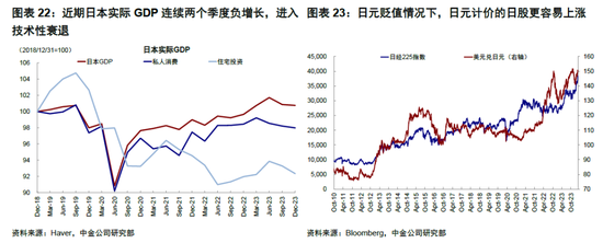 本轮日股上涨有四个主要因素造成:1)AI行情驱动日本科技股上涨。海外AI技术再突破导致全球出现新一轮科技行情,2月7日至今,日股半导体指数上涨7.1%,相关个股如东京电子大涨24.1%。2)市场预期加息延后至4月。日央行是否加息决策依赖通胀和经济是否已经出现可持续复苏,过去一段时间政策退出的时点预期有分歧。在地震后,市场对日央行加息的预期从1月推后至3或4月。近期日本实际GDP连续两个季度负增长的技术性衰退导致市场对日央行退出负利率时点预期进一步向4月靠拢。3)日元贬值。伴随日经指数上涨,日美汇率贬值至150日元/美元。我们在《日股30年新高的启示》指出,日元贬值情况下,日元计价的日股更容易上涨。除了对名义指数的直接影响外,日股60%左右收入来自海外,汇率贬值对企业也通常有利好。4)资本市场改革等其他因素继续延续(《日股还能买么?》)。