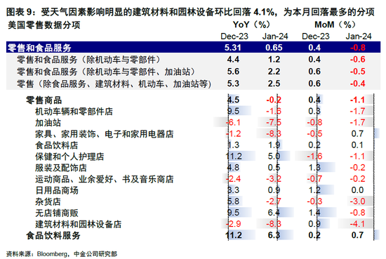 ?12月假日季高基数和1月寒冷天气导致居民线下消费受阻。核心零售(除食品服务、建筑材料、机动车与加油站)环比超预期回落-0.4%。受天气因素影响明显的建筑材料和园林设备环比回落4.1%,为本月回落幅度最大的分项。
