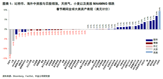 春节假期期间,全球主要股票市场中仅美股收跌,亚太股市表现强劲。整体看,全球主要资产中,比特币、海外中资股(恒生科技、恒生国企、中概股)与日股领涨;相反,天然气、小麦以及美股MAAMNG领跌。