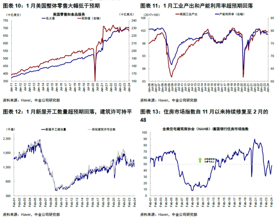 ?新屋开工受寒冷天气影响超预期回落,1月新屋开工环比显著回落15%。但预期未来建筑活动的获批建筑许可(金麒麟分析师)总数147万套,基本持平于9月以来的水平,衡量建筑商景气程度的住房市场指数自11月以来持续修复至2月的48。
