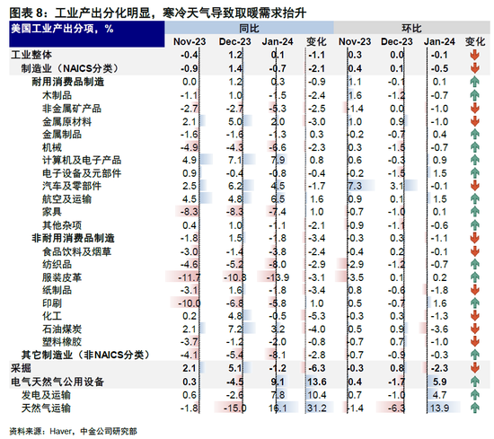 ?工业产出分化明显,寒冷天气导致取暖需求抬升。制造和采掘产出受天气影响分别环比超预期回落0.5%和2.3%,然而寒冷天气导致取暖需求抬升,公用事业产出环比近6%,其中发电及运输抬升4.7%,天然气运输抬升13.9%。