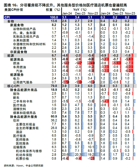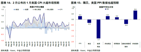 超预期通胀打压降息预期,市场预期推迟到6月。春节假期期间公布的1月美国CPI大超市场预期,整体CPI环比0.31%(我们预测0.09%,一致预期0.2%),核心CPI环比0.39%(我们预测0.32%,一致预期0.3%)。分项看,房租不降反升,其他服务型价格如医疗酒店机票也普遍较高,成为推高通胀的最主要贡献。不仅如此,周五公布的美国PPI数据也超预期,整体和核心环比分别上升至0.3%和0.5%(一致预期0.1%和0.1%),分项看,服务(环比0.6%)抬升而商品(-0.2%)回落。PPI和CPI的超预期抬升导致市场担忧月底披露的PCE数据是否会反弹。在1月非农超预期将降息预期推后至5月后,此次通胀数据大超预期又将其推后至6月。我们认为,此次通胀超预期的确将进一步打压降息预期和节奏,不过也有年初权重调整的因素,虽然回落比预期慢,但并不影响通胀整体回落的方向。我们测算,整体和核心CPI依然有望在年中回落至3%以下。