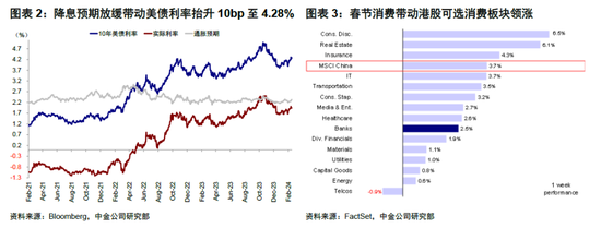 美联储降息预期放缓是美国相关资产表现的主线。春节假期内美国超预期的CPI和PPI数据导致降息时点延后,美债利率抬升10bp至4.28%,当前CME利率期货隐含降息预期已经推迟到6月,全年降息4次。黄金受此影响一度跌破2000美元/盎司,美元指数逼近105。美股也因此回调,尤其是成长股,但幅度有限,也体现出不同资产之间对降息预期的分歧。在外有美债扰动和内无南向流入的情况下,港股假期三天内大涨令人意外。究其原因,除了低估值提供了反弹条件外,这背后,1)既有春节消费推动消费相关板块大涨的影响,纺织服装、酒店餐饮、媒体娱乐、食品零售涨幅都在8%以上;2)也有对节后更多政策支持出台的期待,如MLF下调和LPR是否调降均是值得关注的重点政策窗口。