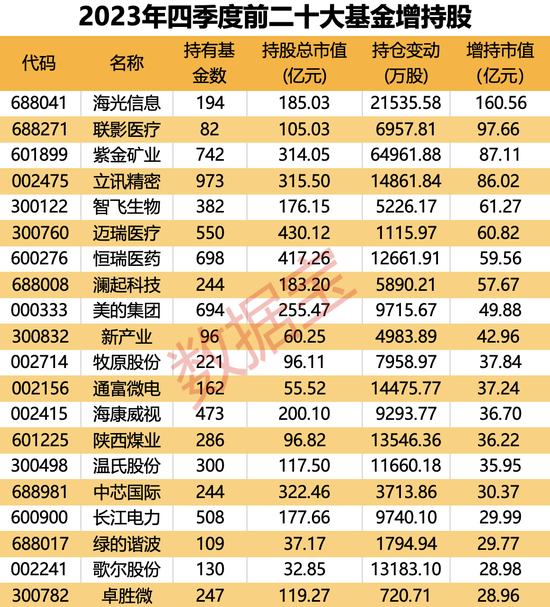 随着公募基金2023年四季报披露收官,基金重仓股随之浮出水面。
