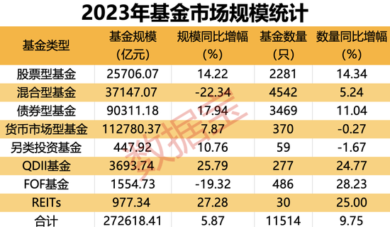 从数量上来看,2023年末公募基金总数达11514只(多份额合并统计),较2022年增长9.75%。其中,REITs和QDII基金数量在2023年呈现明显的增加,同比增长幅度分别为25%和24.77%,最新数量分别为30只和277只。