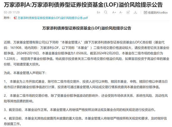 盘后,公司发布溢价风险提示公告称,近期,万家添利(LOF)C类份额二级市场交易价格波动较大,请投资者密切关注基金份额净值。2024年2月19日,本基金基金份额净值为1.0506元,截至2月20日,本基金在二级市场的收盘价为1.228元,明显高于基金份额净值。特此提示投资者关注二级市场交易溢价风险,如果盲目投资高溢价率的基金份额,可能遭受重大损失。
