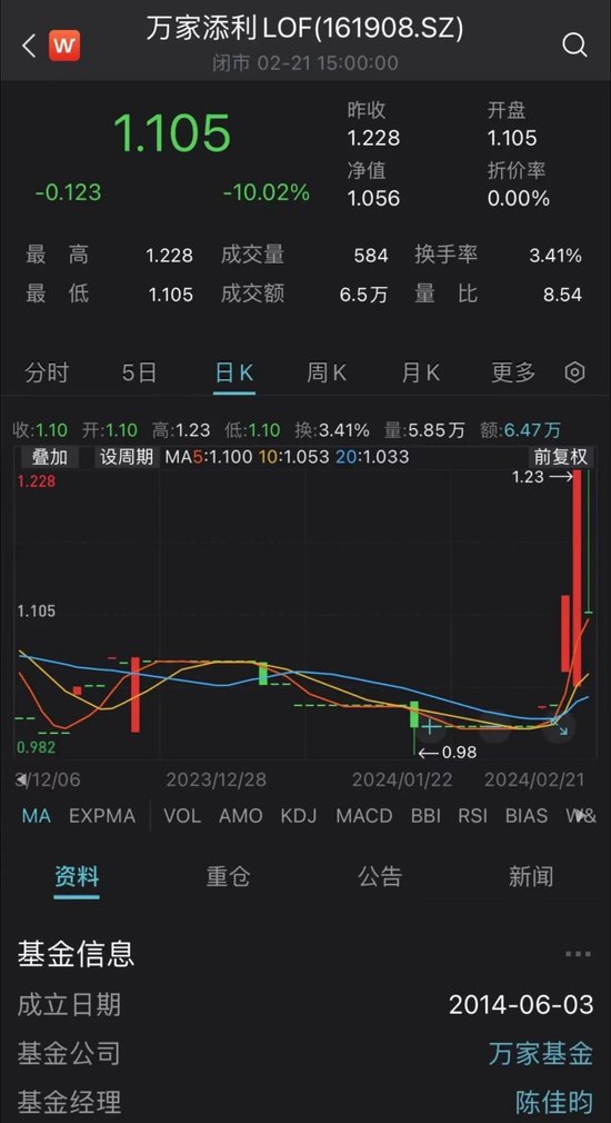 2月20日,万家添利LOF二级市场价格异动,当日收涨9.74%,至1.228元;基金单位净值涨幅为0.5%,最新净值1.056元,溢价率超过16%。