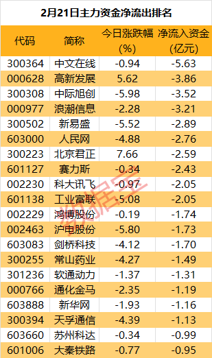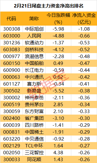 数据宝统计,中际旭创尾盘主力资金净流出1.08亿元,居首位;其后人民网和软通动力尾盘主力资金净流出分别为0.66亿元和0.53亿元。
