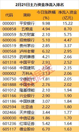 平安银行主力资金净流入15.22亿元,居首位。银行行业连续两日拉升,平安银行今日罕见涨停,农业银行和中国银行盘中股价均创历史新高。