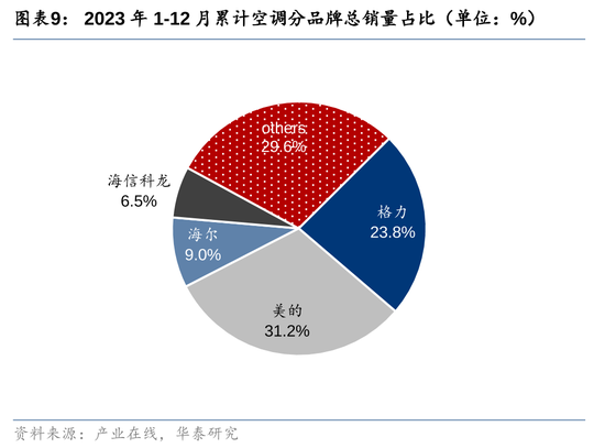 华泰证券综合产业在线数据指出,2023年全年空调总销量超过17000万台,同比增长11.2%,格力总销量同比增长2.4%,美的同比增长5.5%,海尔同比增长9.1%。受到二三线品牌投入的影响,三大白电龙头企业份额都小有波动,而格力是掉得最多的,总销量份额同比下降了两个点。