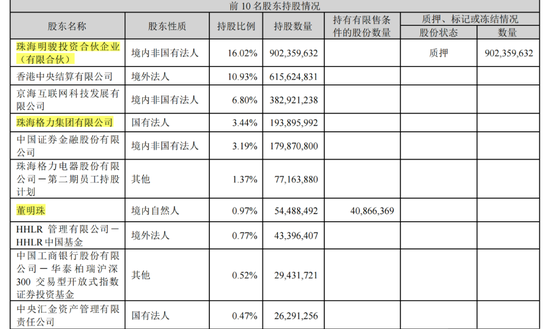 前10名股东持股情况。图/格力电器2023年第三季度报告