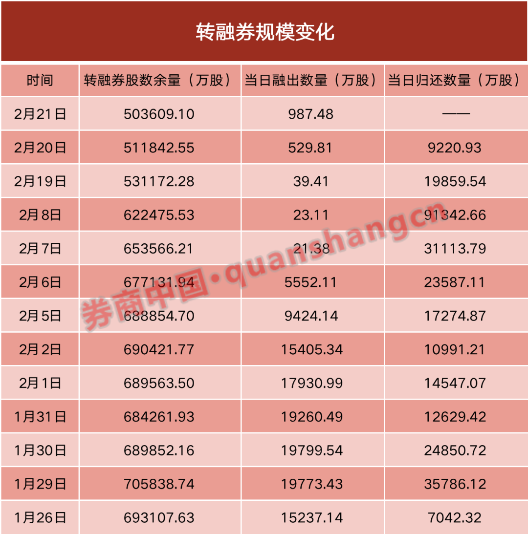 就转融券的归还而言,券商之所以归还通过转融券方式借来的券,是因为最终的投资者在还券。融券的存量数据也证实了这一点。2月6日,沪深交易所的融券余量为95.16亿股,而到2月20日,这一数据是65.59亿股,5个交易日下降了31%。