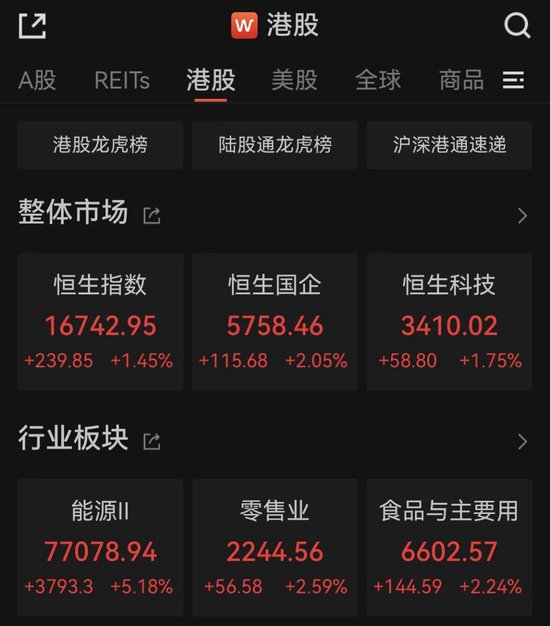2月22日,港股三大指数午后拉升。截至收盘,恒生指数上涨1.45%;恒生国企指数上涨2.05%;恒生科技指数上涨1.75%。