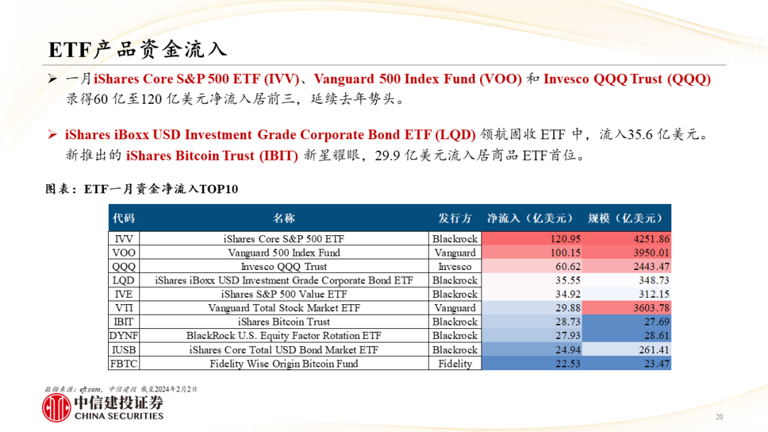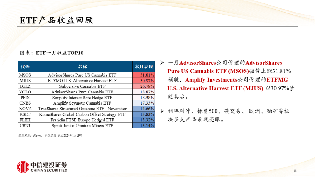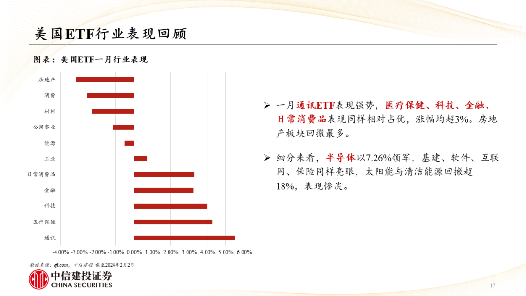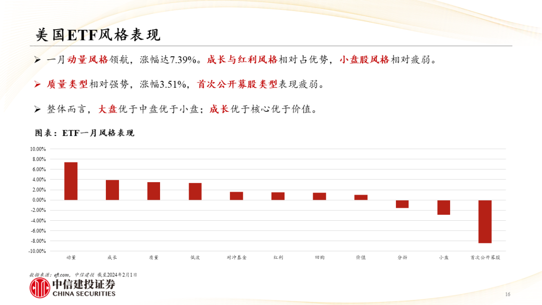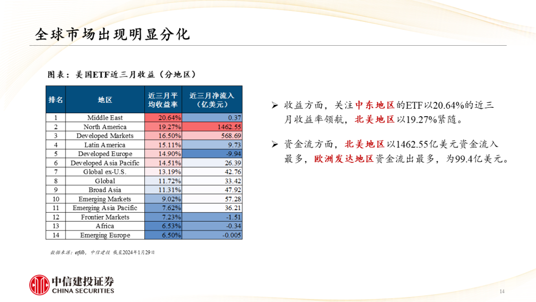 国际市场上,不同风格、行业、地区的ETF表现出现明显分化。风格来看,相比于我国市场红利低波领航,美国市场动量、成长风格相对占优。行业上,美国通讯、金融、科技板块持续跑赢,而我国煤炭等周期赛道领涨。地区上,中东地区的ETF近三月ETF(截至1月29日)平均收益超20%,领跑全球。