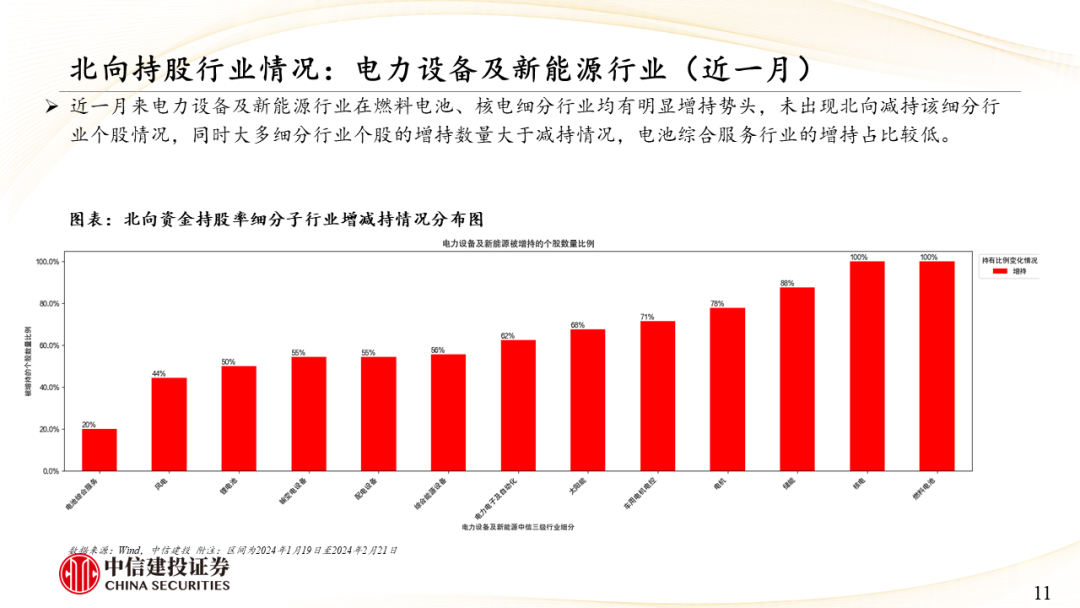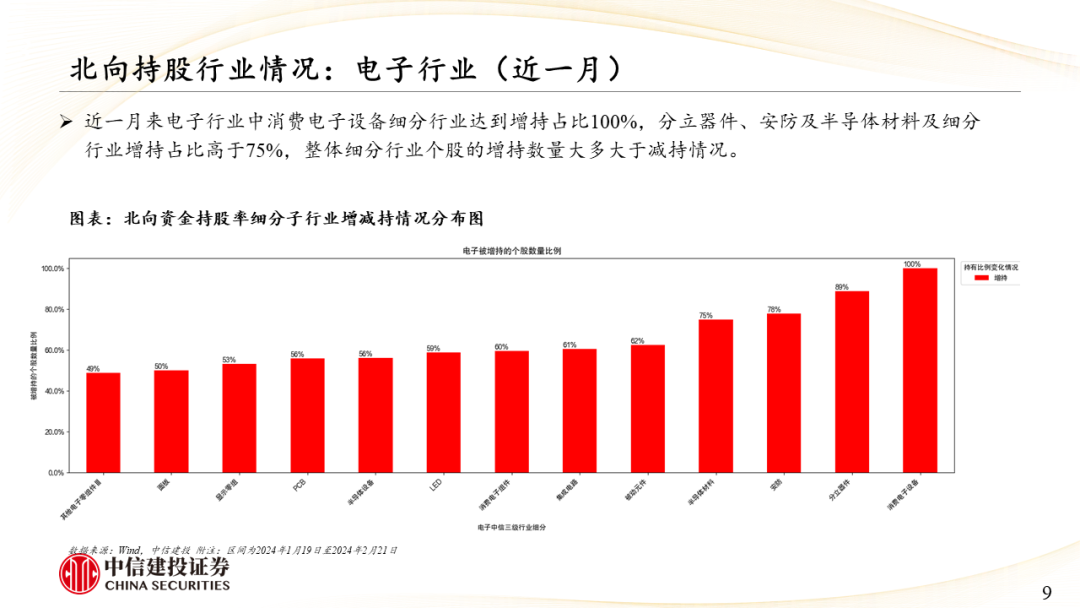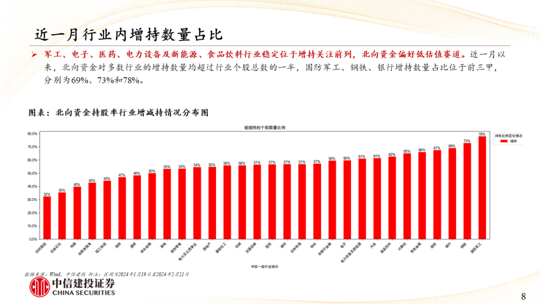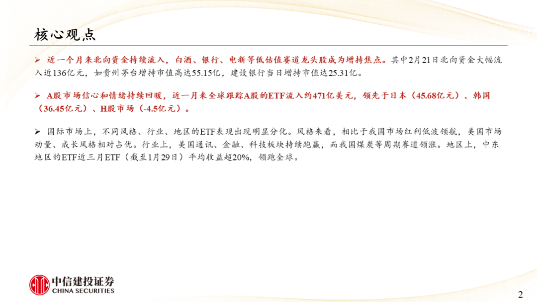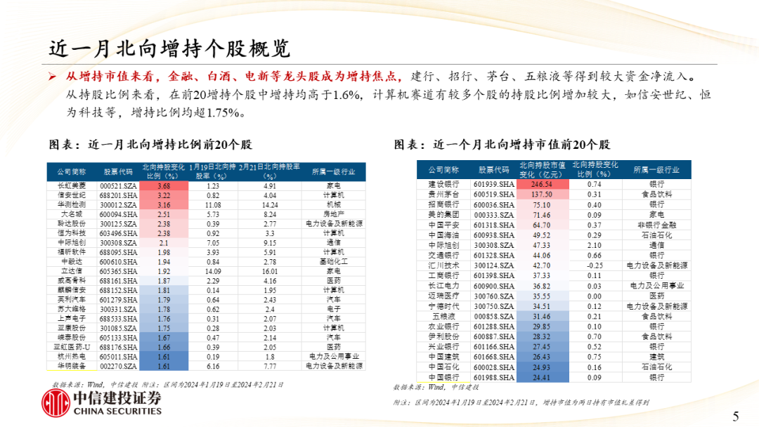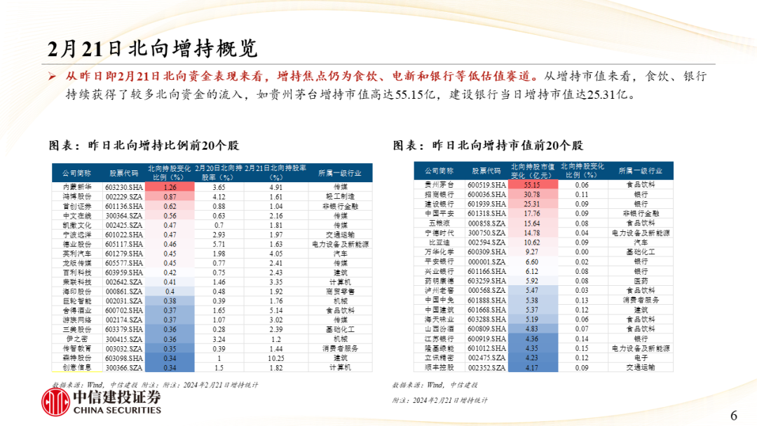 近一个月来北向资金持续流入,白酒、银行、电新等低估值赛道龙头股成为增持焦点。其中2月21日北向资金大幅流入近136亿元,如贵州茅台增持市值高达55.15亿,建设银行当日增持市值达25.31亿。