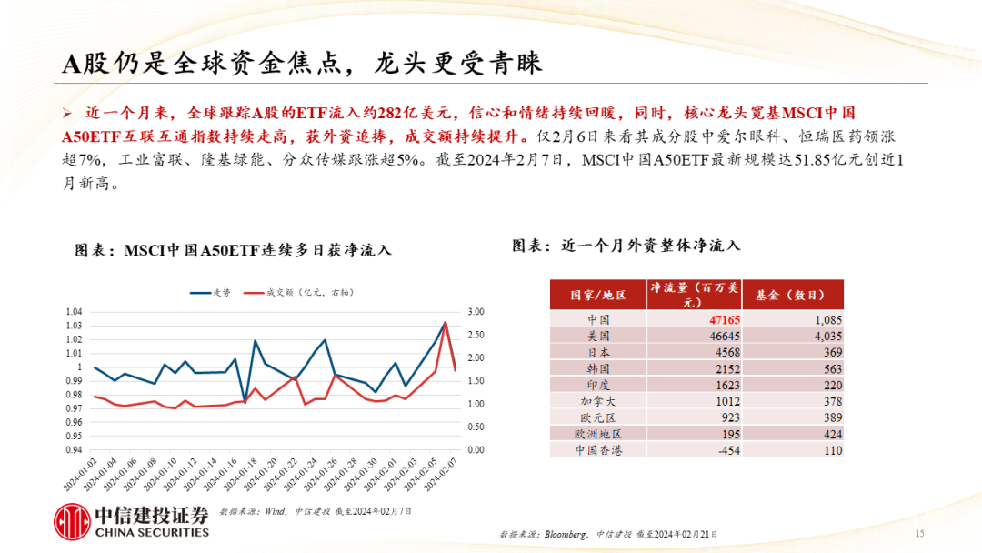 A股市场信心和情绪持续回暖,近一月来全球跟踪A股的ETF流入约471亿美元,领先于日本(45.68亿元)、韩国(36.45亿元)、H股市场(-4.5亿元)。