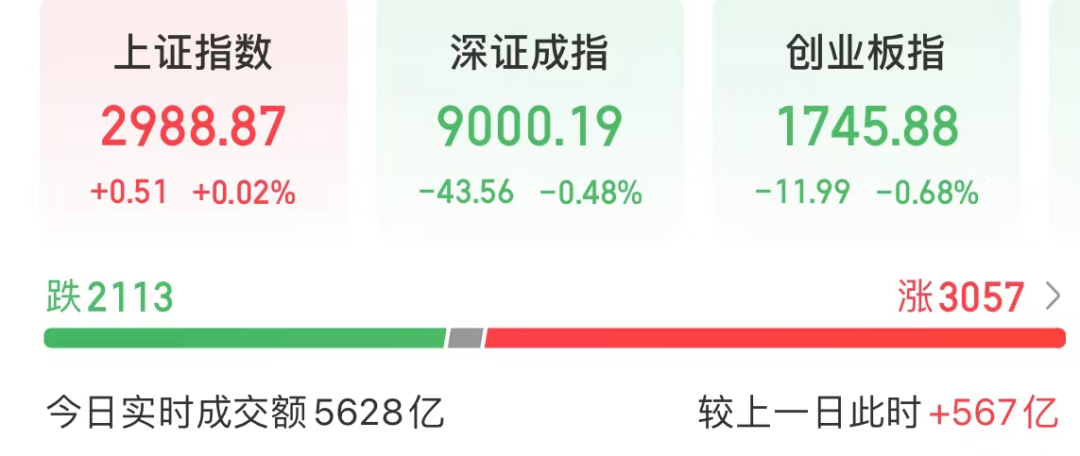 上午收盘,上证指数上涨0.02%,深证成指下跌0.48%,创业板指下跌0.68%。逾3000只个股上涨,仅有一只ST股跌停。