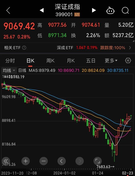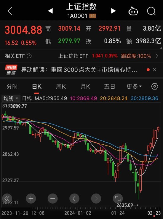 2月23日,A股延续此前上涨势头,三大股指高开后,盘中保持震荡态势,最终沪指八连阳收复3000点。