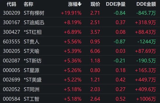 将时间线拉长来看,龙年以来,ST板块指数已连续5日收阳,累计涨幅达到14.38%。这期间,ST有棵树涨幅居首,高达88.19%;ST迪威迅、*ST天山(维权)、*ST三盛(维权)累计涨幅也均超过30%。