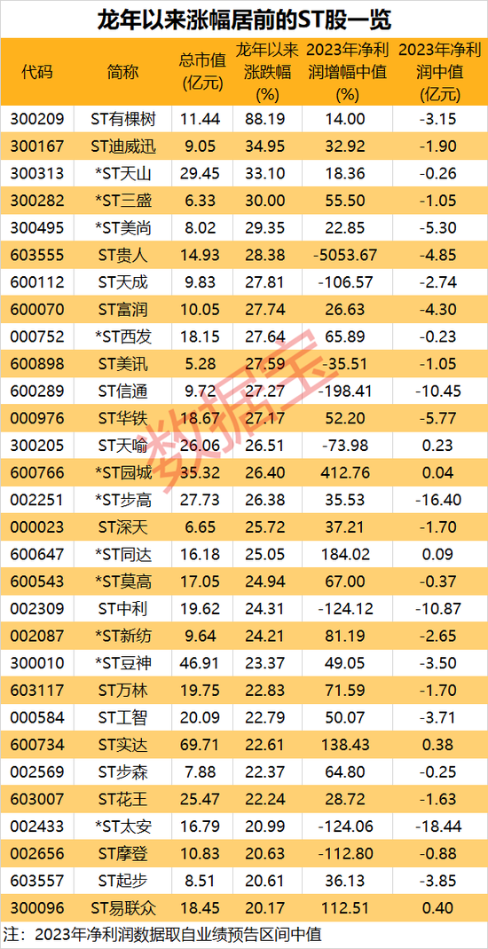 证券时报·数据宝梳理了龙年以来累计涨幅超过20%的ST股,共计30只。从业绩方面来看,虽说大多数个股净利润表现同比向好,但全年经营仍是亏损,真正实现盈利的仅有5股,分别为ST易联众(维权)、ST实达(维权)、ST天喻(维权)、*ST同达和*ST园城,且净利润规模均在5000万元以下。市场对于ST股的热捧,也许更多的仍在于其作为“壳资源”的价值。