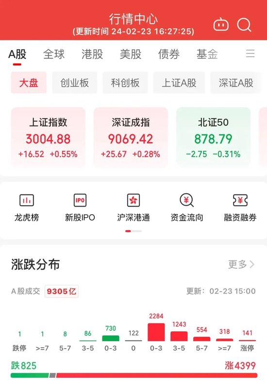 2月23日,沪指继续反弹,收涨0.55%。2月6日至今,沪指录得八连阳,累计涨幅11.2%,成功收复3000点,报3004.88点。深成指上涨0.28%,创业板指涨0.02%。市场交易活跃,沪深京三市上涨个股近4400只,成交额达9300.85亿元。