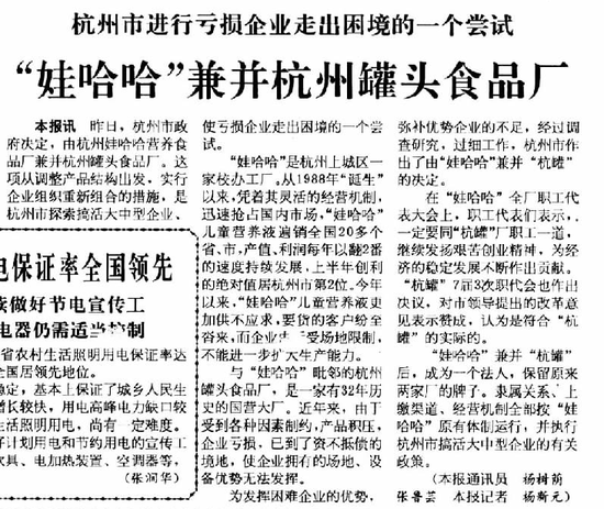 1991年,创业三年多,宗庆后气势如虹,带领杭州娃哈哈营养食品厂成功兼并了2200多人、欠债6000多万元的国有老牌企业杭州罐头厂,28天飞速拉起新生产线,产出新品果奶,“小鱼吃大鱼”,一时轰动全国。