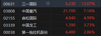 2月26日消息,政策推动新一轮大规模设备更新和消费品以旧换新,重型机械股集体拉升,三一国际涨超13%,中国重汽涨超7%,森松国际涨近5%。