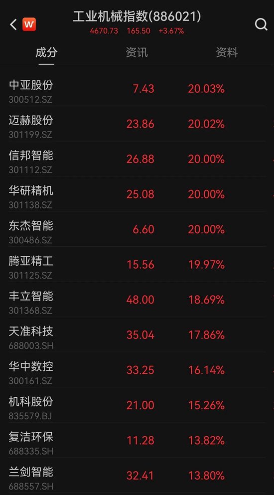 2月23日,中央财经委员会第四次会议提出,推动新一轮大规模设备更新和消费品以旧换新,有效降低全社会物流成本。受此消息影响。2月26日早盘,工业机械板块高开高走,以华研精机为代表的近30只个股涨停。
