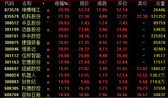 受中央推动大规模设备更新消息提振,工业母机、高端装备板块今日强势拉升,截至收盘,坤博精工、迈赫股份、华中数控、信邦智能、宏德股份、华东重机等涨停,德恩精工涨超19%,科德数控等涨超10%。