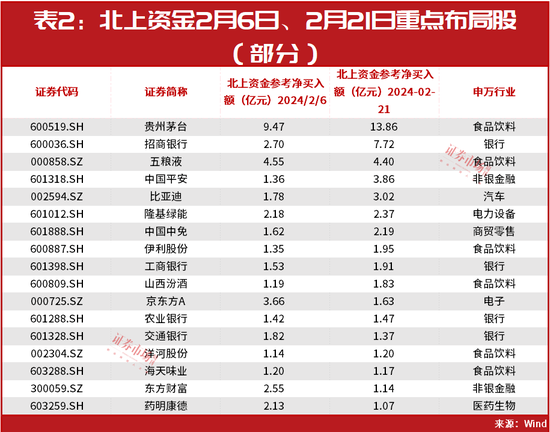进一步来看,2月6日、2月21日,包括贵州茅台、招商银行、比亚迪、隆基绿能、中国中免等在内的多家公司均连续获得了北上资金的大手笔增仓(见表2)。