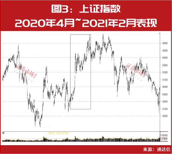 北上资金于2020年4月7日与4月14日两个交易日净流入金额均超过百亿元,在此之后,市场同样开启了强势反弹模式,如上证指数于2020年4月持续震荡上涨至2021年2月中旬,期间累计上涨超过30%(见图3)。