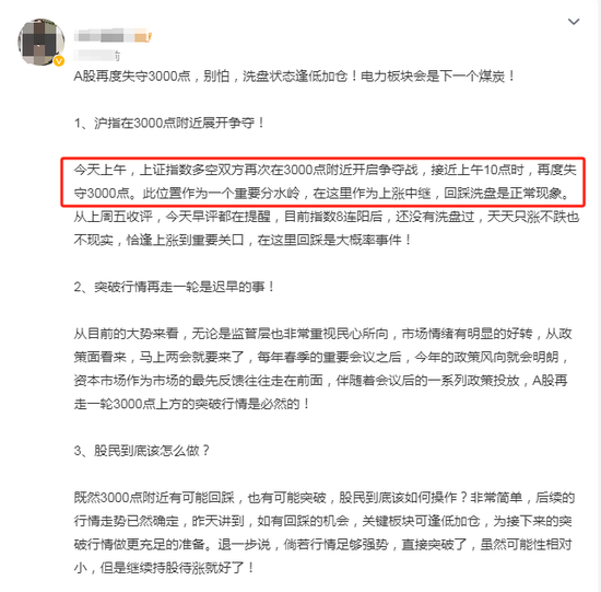 也有财经大V 表示,“(3000点)此位置作为一个重要分水岭,在这里作为上涨中继,回踩洗盘是正常现象。”“A股再走一轮3000点上方的突破行情是必然的!关键板块可逢低加仓,为接下来的突破行情做更充足的准备。”该财经大V如是说。