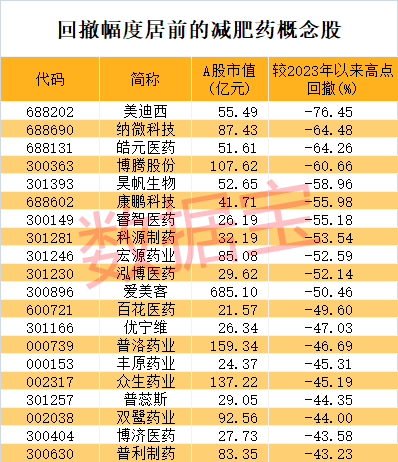二级市场表现来看,减肥药概念股春节后持续反弹。截至2月28日收盘,诺泰生物、爱美客、丽珠集团、金凯生科、众生药业5股年内涨幅为正值。不过与前期高点相比,仍有不少股票处于超跌状态。数据宝统计,2月28日收盘价与2023年以来高点相比,减肥药概念股回撤均值为40.83%。美迪西、纳微科技、皓元医药、博腾股份回撤幅度逾60%。