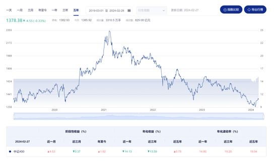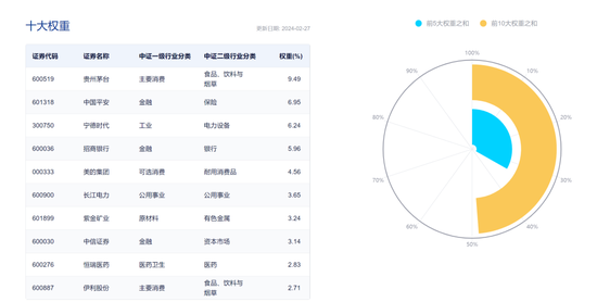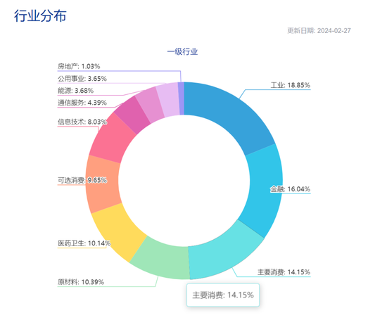 具体来看,中证A50指数样本兼具大市值属性与行业代表性。截至2024年2月28日,指数自由流通市值达到7.1万亿元。从行业分布来看,工业占比最高,为18.85%;随后是金融和主要消费,占比分别为16.04%和14.15%,三大行业共计占比近一半。