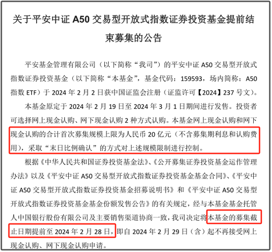 在今日收盘之后,平安基金也发布公告,平安中证A50 ETF有效认购申请总额超过募集规模上限20亿元,也宣布旗下A50 ETF提前结束募集,同样是今日为最后一个募集日。