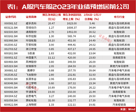 A股汽车股的2023年财报同样有不错的表现。统计155家发布2023年业绩预告的公司来看,112家业绩预增上限(下同)为正值,占比超过7成,90余家公司超过90%。另外,包括威孚高科、华培动力、玲珑轮胎、万安科技、浙江世宝、英搏尔、均胜电子、日盈电子等在内的公司则均超过100%(见表1)。