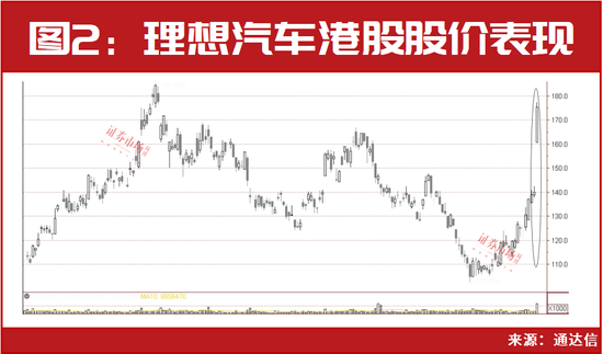 理想汽车披露的财报数据,同样“抢镜”。据其2月26日披露的2023年度业绩报显示,实现营收约1238.51亿元,同比增长173.5%;实现净利润超过110亿元,首次实现全年扭亏为盈。受此刺激,公司港股股价于2月27日跳空上涨25%,创去年8月以来新高(见图2)。