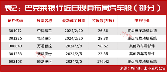 另外,据汽车零部件公司万通智控、盛帮股份、腾龙股份披露的最新股东持仓显示,巴克莱银行同样均以新进姿态现身其中(见表2)。