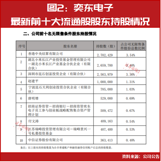 相较于对瑞德智能的持续增持,奕东电子2月20日披露的公告中,以2月6日的持仓情况统计,赵建平也仍继续稳坐公司前十大流通股股东,但相较2023年三季度末150万股的持仓,持股数减少了50万股(见图2)。