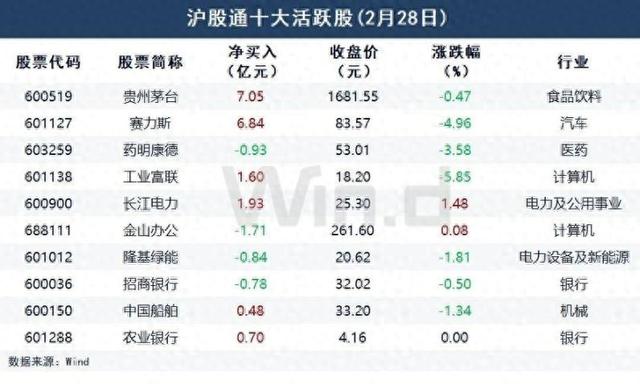 前十大成交股中,净买入额居前三的是贵州茅台(600519)、赛力斯(601127)、中际旭创(300308),分别获净买入7.05亿元、6.84亿元、3.97亿元。净卖出额居前三的是比亚迪(002594)、金山办公(688111)、TCL中环(002129),分别遭净卖出2.17亿元、1.71亿元、1.66亿元。