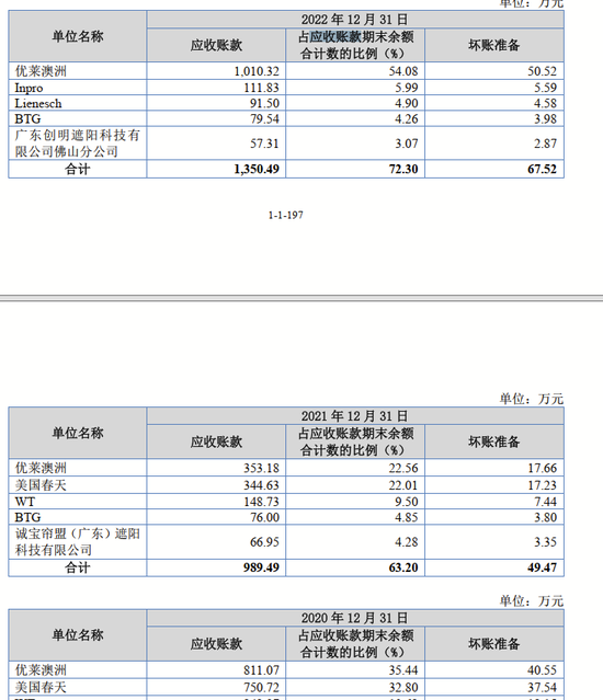 与优莱澳洲的合作,为温多利带来远高于其他客户的应收账款。《招股书》显示,2020年-2022年,优莱澳洲对温多利的应收账款余额分别为811.07万元、353.18万元和1010.32万元,占温多利所有应收账款的比重分别达到35.44%、22.56%和54.08%。相比之下,2020年-2021年,温多利第一大客户美国春天,给公司带来的应收账款,仅有750.72万元、344.63万元,占温多利所有应收账款的比重为32.8%和22%。2022年甚至都未出现在应收账款前五名中。