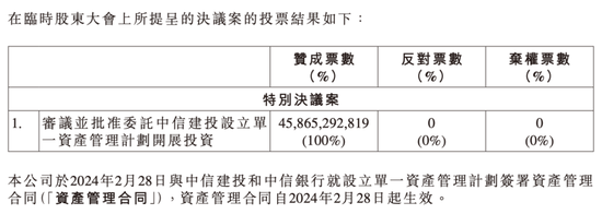 2月28日,中信金融资产公告称,该公司召开临时股东大会并审议通过了委托中信建投设立单一资产管理计划的决议。同日,中信金融资产与中信建投和中信银行就该资管计划签订合同并于当日生效。