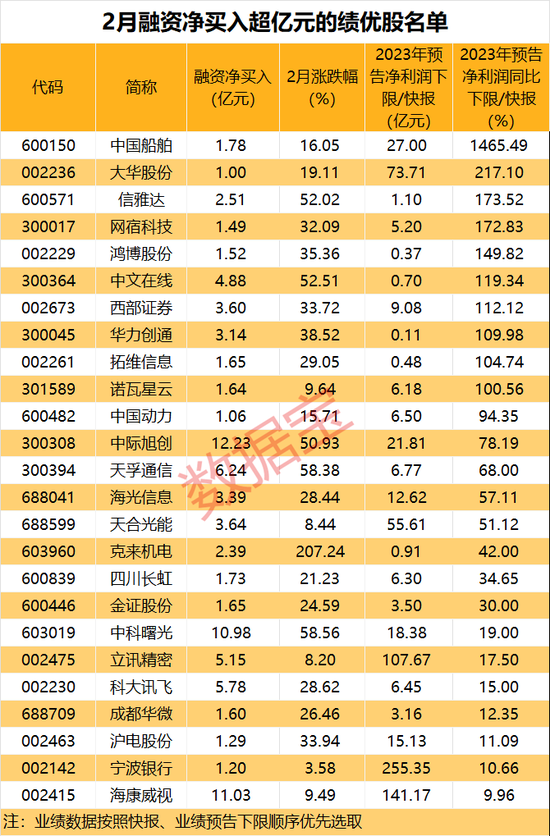 目前融资净买入超亿元个股中,有39股发布2023年业绩预告或快报,结合预告下限和快报数据来看,中国神华、宁波银行、海康威视、立讯精密的净利润规模居前,均超百亿元。净利润盈利的个股中,中国船舶、大华股份、信雅达、网宿科技等7股的净利润同比2022年实现翻倍增长。中国船舶业绩增幅最大,公司目前仅发布业绩预告,预测净利润约27亿元至32亿元,较上年同期变化约为1465.49%至1755.4%。
