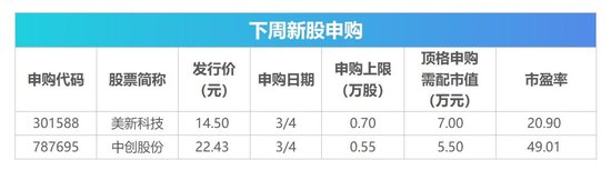 下周一将有2只新股申购,分别是中创股份、美新科技,其中,中创股份为科创板,美新科技为创业板。