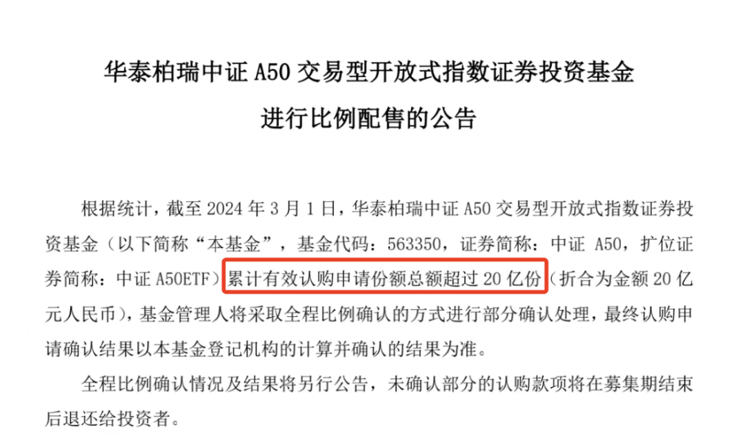 3月1日,华泰柏瑞基金公告称,华泰柏瑞中证A50ETF累计有效认购总额超过20亿元,触发比例配售。华泰柏瑞中证A50ETF也是继摩根、平安、大成三家基金公司之后,第四只触及比例配售的中证A50ETF。