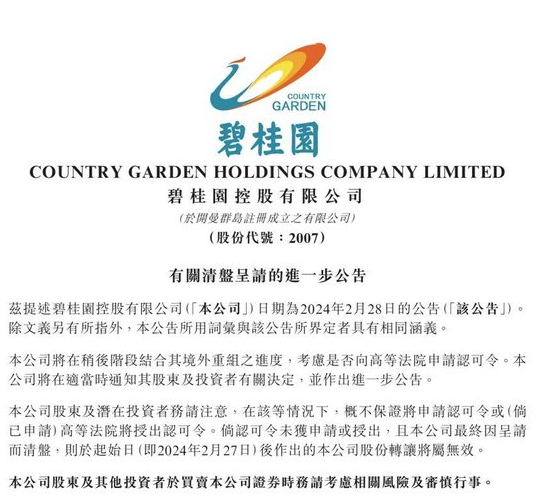 3月4日晚间,碧桂园发布有关清盘呈请的进一步公告称,公司将在稍后阶段结合其境外重组的进度,考虑是否向香港高等法院申请认可令。