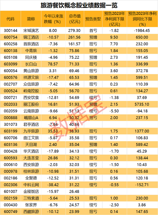 证券时报·数据宝梳理26只旅游餐饮概念股发现,截至目前,24只概念股发布了2023年全年业绩预告,其中14股业绩预计扭亏,5股业绩预计同比增长。