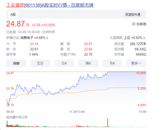 值得注意的是,工业富联午后强势拉升,截至收盘,该股报24.87元,最新市值4940亿元。至此,该股自2月以来已累计大涨近90%。公司近日在公告中指出,经自查,公司目前生产经营活动正常,主要客户及主要产品均未发生重大变化,不存在应披露而未披露的重大信息。公司不存在对公司股票交易价格产生影响的媒体报道或市场传闻。