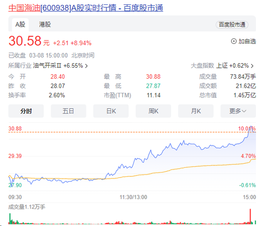 值得注意的是,市值超万亿的中国海油盘中一度涨停,续创历史新高,收盘涨约9%。